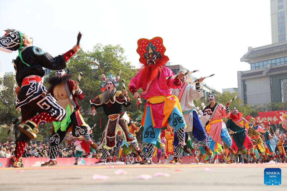 Artists perform during a Yingge dance carnival event celebrating the Spring Festival in Chaoyang District of Shantou, south China's Guangdong Province, Feb. 21, 2026. During the Spring Festival holiday, many Yingge dance teams have staged wonderful performances across China.
