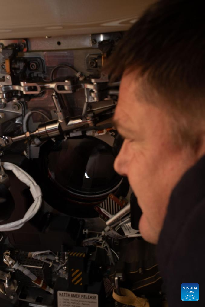 Canadian Space Agency astronaut Jeremy Hansen peers out one of the Orion spacecraft's windows looking back at Earth, on April 6, 2026. The crew of the Artemis II mission on Monday broke the record for the farthest distance from Earth ever traveled by humans, surpassing the milestone achieved by Apollo 13 in April 1970, according to NASA. (NASA/Handout via Xinhua)