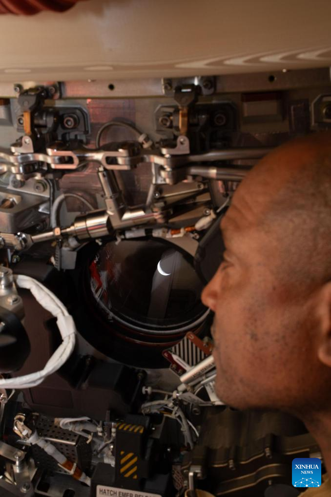 NASA astronaut Victor Glover peers out one of the Orion spacecraft's windows looking back at Earth, on April 6, 2026. The crew of the Artemis II mission on Monday broke the record for the farthest distance from Earth ever traveled by humans, surpassing the milestone achieved by Apollo 13 in April 1970, according to NASA. (NASA/Handout via Xinhua)