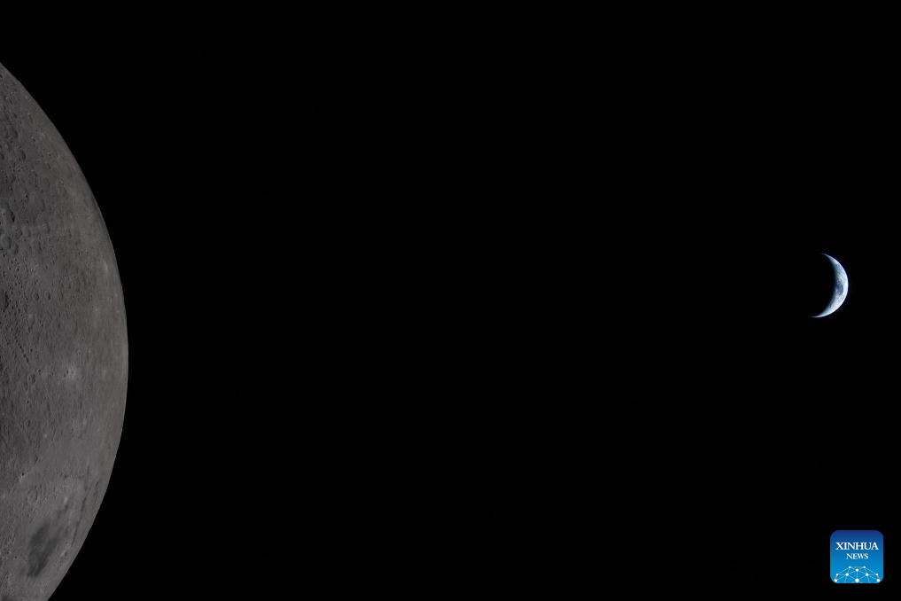 Photo taken on April 6, 2026, shows the Moon (L) and Earth seen from the Orion spacecraft. (NASA/Handout via Xinhua)