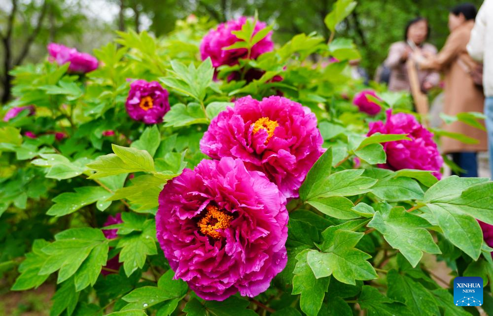 People enjoy peony flowers at a park in Jinan, east China's Shandong Province, April 9, 2026. (Xinhua/Xu Suhui)