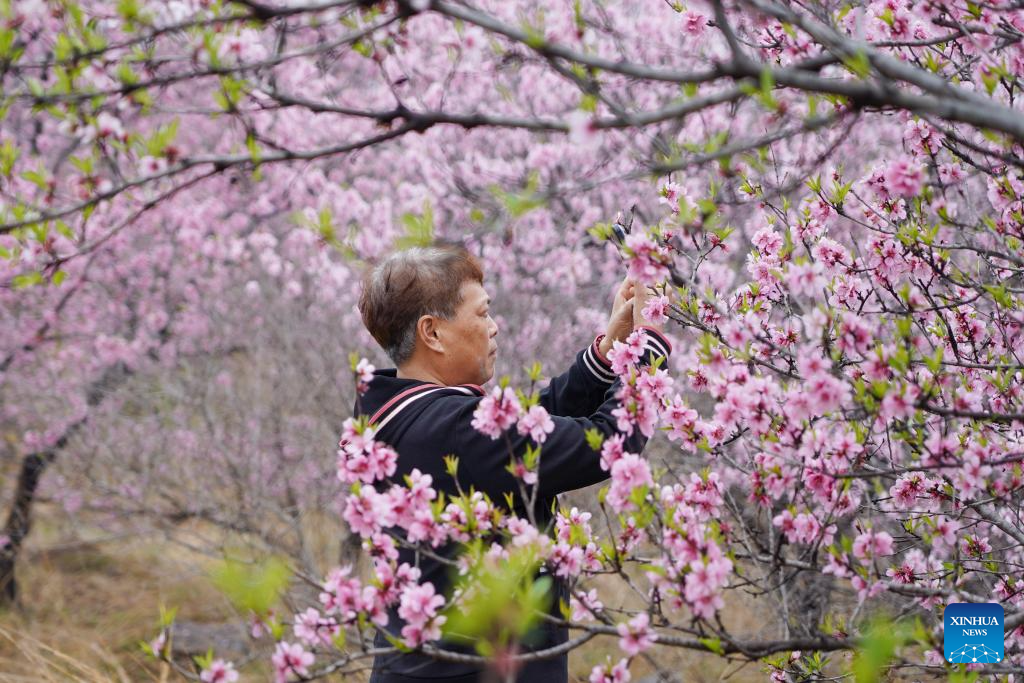 A visitor takes photos of peach flowers in Shangjiao Village, Zibo City of east China's Shandong Province, April 9, 2026. (Xinhua/Zhu Zheng)
