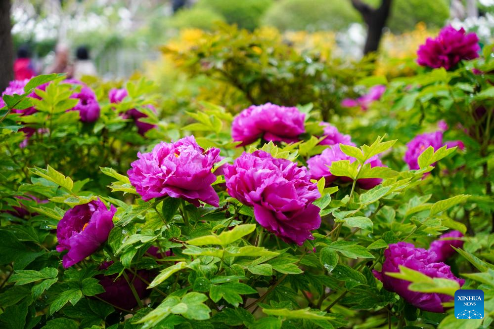 Peony flowers are seen at a park in Jinan, east China's Shandong Province, April 9, 2026. (Xinhua/Xu Suhui)