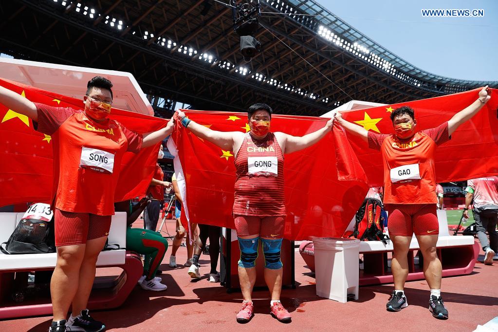 Song Jiayuan, Gong Lijiao and Gao Yang of China (L to R) celebrate after the women's shot put final at Tokyo 2020 Olympic Games, in Tokyo, Japan, Aug 1, 2021. (Xinhua/Wang Lili)