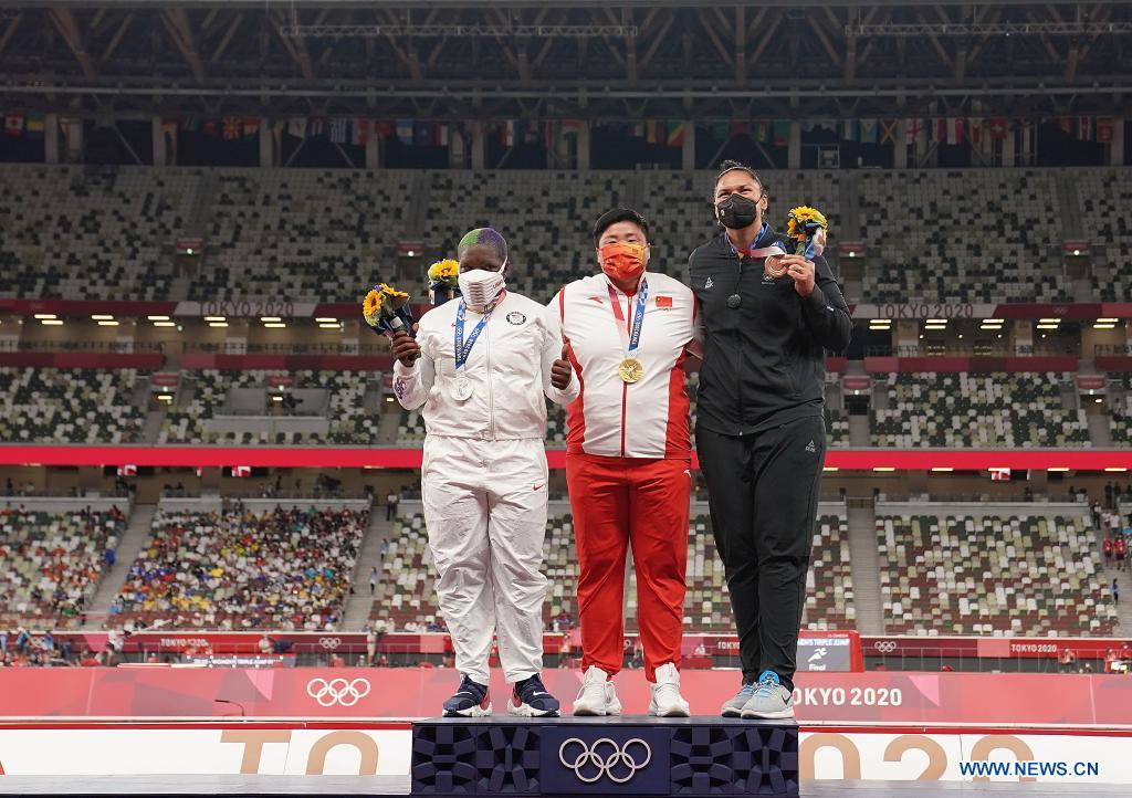 Gold medalist Gong Lijiao (C) of China, silver medalist Raven Saunders (L) of the United States and bronze medalist Valerie Adams of New Zealand react during the awarding ceremony of the Women's Shot Put at the Tokyo 2020 Olympic Games in Tokyo, Japan, Aug. 1, 2021. (Xinhua/Ju Huanzong)