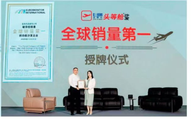 活动中,欧睿国际亚太区高级总裁穆愔女士为芝华仕品牌母公司敏华控股颁发了欧睿国际认证的2024年度全球销量第一的功能沙发企业证书。
