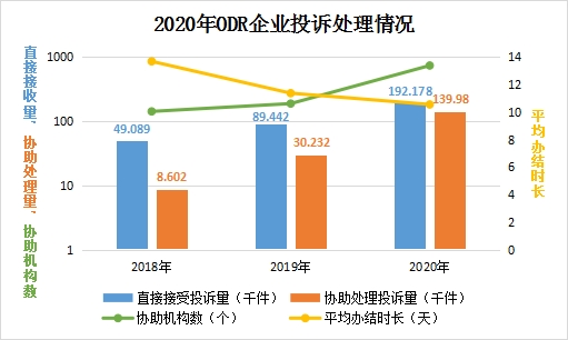 2020年,市場(chǎng)監(jiān)管部門(mén)大力推進(jìn)在線糾紛和解機(jī)制建設(shè),努力把消費(fèi)糾紛化解在源頭、解決在基層、和解在企業(yè)。全國(guó)12315平臺(tái)共發(fā)展ODR企業(yè)2.55萬(wàn)家,主動(dòng)與消費(fèi)者協(xié)商糾紛19.22萬(wàn)件,與傳統(tǒng)調(diào)解方式相比,和解率高出6.21個(gè)百分點(diǎn),平均處理時(shí)長(zhǎng)縮短7.76天,消費(fèi)者滿意度4.07分(滿分5分),ODR城市覆蓋率由25.60%增加到91.11%。與2019年相比,2020年ODR機(jī)制運(yùn)行質(zhì)量有了明顯提高,投訴處理量、辦理效率、和解成功率、消費(fèi)者滿意度等各方面均有明顯提升,維權(quán)效能日益突顯。