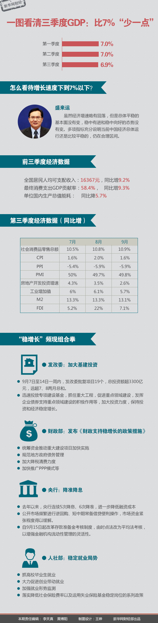 ????新華網(wǎng)北京10月19日電(記者 徐曼曼)備受關(guān)注的中國(guó)經(jīng)濟(jì)“三季報(bào)”今日揭開面紗。國(guó)家統(tǒng)計(jì)局?jǐn)?shù)據(jù)顯示,三季度GDP同比增幅為6.9%,創(chuàng)下自2009年以來(lái)的最低增速,系官方首次以分季方式核算的GDP數(shù)據(jù)。初步核算,前三季度國(guó)內(nèi)生產(chǎn)總值487774億元,按可比價(jià)格計(jì)算,同比增長(zhǎng)6.9%。