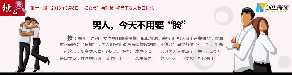 @蘄鄉(xiāng)農(nóng)夫: 在婦女節(jié)到來之時,向長期戰(zhàn)斗在試衣間,看韓劇,不做飯,魅力十足并掌握另一半錢包的杰出女性們致以節(jié)日的問候。祝所有美女們:三圍魔鬼化,收入白領(lǐng)化,家務(wù)甩手化,快樂日?;?,愛情持久化,情調(diào)小資化,購物瘋狂化,老公奴隸化,祝三八婦女節(jié)快樂!