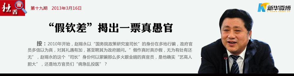 一句話告訴你真相 一句話評趙錫永事件:騙子騙術并不高明,只是這些地方官員見到“上面”來的,便做條件反射式的恭迎,而不敢去做辨別,唯恐犯了大不敬,背后還是“官本位”的思想在作怪。
