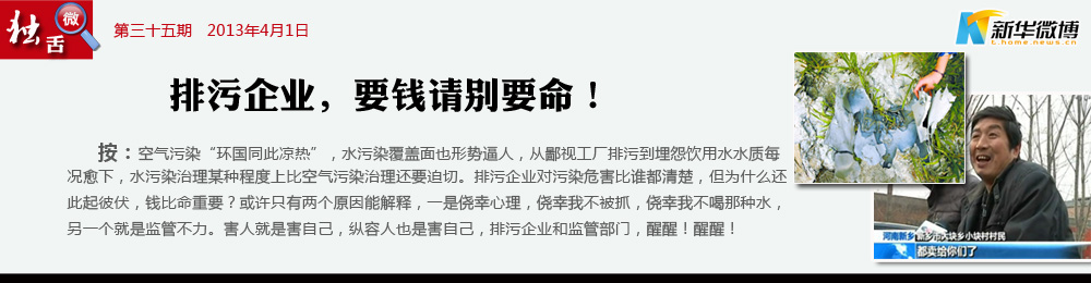 【紙水澆麥田 記者:你們敢吃嗎?村民:都賣給你們了!】 河南新鄉(xiāng)鳳泉區(qū)大塊鄉(xiāng),村民都用造紙廠的 污水澆灌麥田,被央視曝光。村民說(shuō),打井抽不出水,只能用工廠污水澆田。記者問(wèn):這水澆出的麥子 你們敢吃?村民的回答很直接:都賣給你們了,我們自己不吃。
