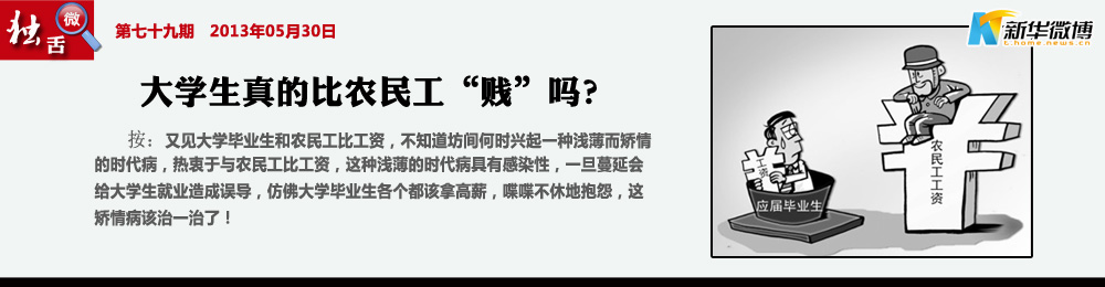 【新名詞:大學(xué)生農(nóng)民工】 他們出身農(nóng)村、考上大學(xué)進(jìn)入城市,畢業(yè)后與進(jìn)城打工的父兄匯流,又重新站在了同一條起跑線上;他們與新生代農(nóng)民工職業(yè)混同,工資相差無幾,生活境遇同樣是在城鄉(xiāng)之間漂浮。對這樣一個近幾年涌現(xiàn)的年輕人群體,我們稱之為“大學(xué)生農(nóng)民工”。