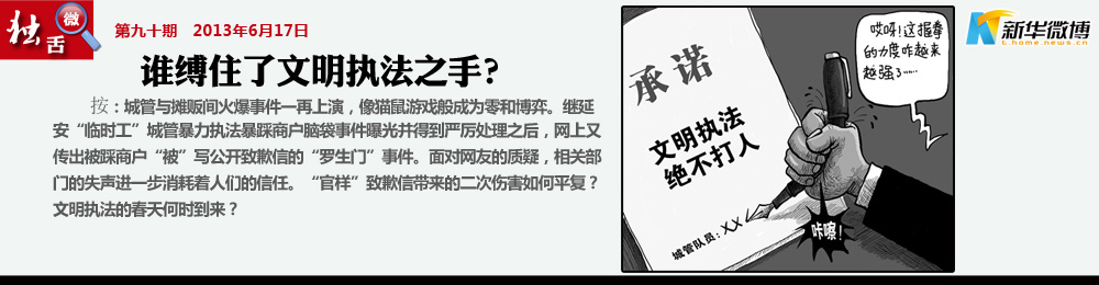 暴力執(zhí)法誰(shuí)來負(fù)責(zé) 延安城管暴力執(zhí)法事件引來眾議,臨時(shí)工又“果然不出網(wǎng)民所料”地成為擋箭牌。什么叫臨時(shí)工?網(wǎng)友回答:負(fù)責(zé)提供“臨時(shí)性攻擊”、關(guān)鍵時(shí)刻隨時(shí)準(zhǔn)備替領(lǐng)導(dǎo)們頂罪的人。法律未賦權(quán)的人員本來就不具有執(zhí)法權(quán),這是法治應(yīng)有之義。