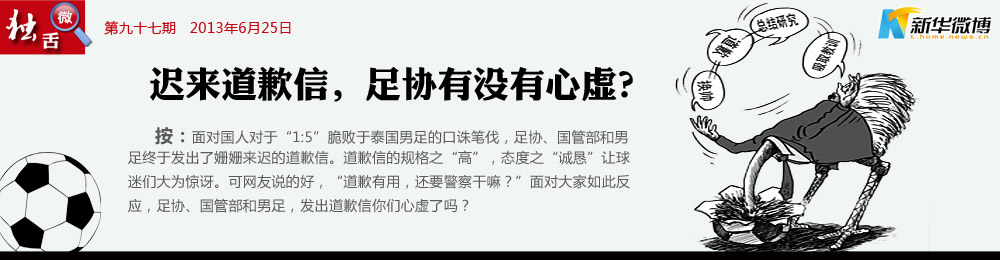 央視也不能忍了 “這樣的檢查沒(méi)有觸及靈魂,應(yīng)該打回去重寫?!薄胍曉u(píng)足協(xié)道歉。足協(xié)、國(guó)管、國(guó)足上演道歉信帽子戲法,怎么看怎么像兒戲,別說(shuō)觸及靈魂了,純屬耍嘴皮子。