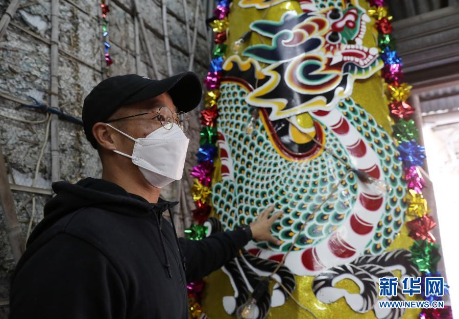 花牌師傅黎俊霖介紹“飛龍在天”龍柱(1月25日攝)。新華社記者 李鋼 攝