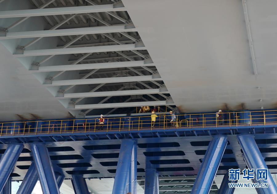 2月26日,從早晨7時開始,歷時5個小時,首次利用海潮漲落的“浮托法”,70多位現(xiàn)場施工人員經(jīng)過緊張調(diào)試,將內(nèi)地預(yù)制好的雙拱鋼橋精準對接并安裝在橋墩上。