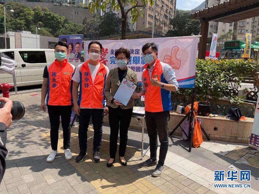 3月15日,香港特區(qū)行政長(zhǎng)官林鄭月娥(右二)在位于港鐵堅(jiān)尼地城站的街站展示簽名。新華社發(fā)