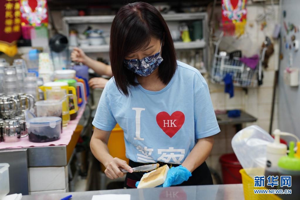 在香港鯉魚(yú)門“銀龍咖啡茶座”餐廳,女老板李凱瑚在為客人制作餐食(7月26日攝)。新華社記者 王申 攝