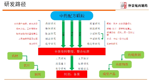 中藥配方顆粒的研制路線是從產(chǎn)品研制開始,要經(jīng)過標(biāo)準(zhǔn)復(fù)核、現(xiàn)場檢查、專家評(píng)審等環(huán)節(jié),最終需獲得藥監(jiān)管理部門的備案許可。研制路徑的重點(diǎn)主要是前期大量文獻(xiàn)的調(diào)研、過程中質(zhì)量控制的一致性研究和工藝的穩(wěn)定性、有效性再評(píng)價(jià)等,對(duì)企業(yè)的研發(fā)、人才及經(jīng)濟(jì)方面的投入要求非常高。