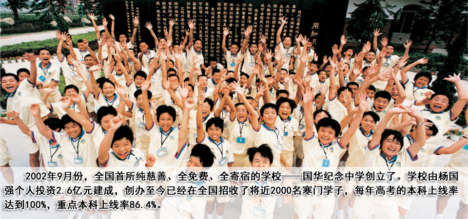 在楊國華去世10多年以后,楊國強計劃,以大哥的名字成立一所學(xué)校,一所只招收中國最貧困、最優(yōu)秀學(xué)生的全日制慈善高中——國華紀(jì)念中學(xué),以此來紀(jì)念英年早逝的大哥。