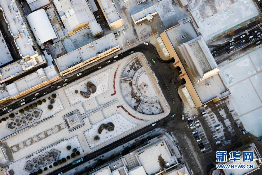 3月1日拍攝的雪后甘肅省武威市南城門廣場(chǎng)(無人機(jī)照片)。新華社發(fā)(姜愛平 攝)