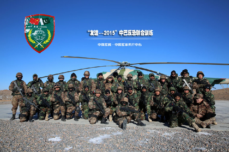 Soldiers from both sides pose for a group photo after the joint training. The China-Pakistan “Friendship -2015” joint anti-terrorism training, which kicked off in China's Ningxia Hui Autonomous Region on Dec. 8, entered the phase of comprehensive drills on December 13, 2015. This is the fifth joint anti-terrorism training between the land forces of China and Pakistan. Each side sent 100 soldiers to participate in the training. The joint training consists of two phases, i.e. anti-terror tactics training and comprehensive drills, aiming to improve the interoperability between the land forces of the two countries in joint anti-terrorism operations.