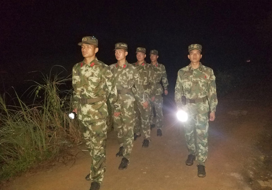 ????7月31日,在廣西梧州市蒼梧縣沙頭鎮(zhèn)參田村,武警梧州市支隊官兵在村里巡邏排查受災情況(手機拍攝)。