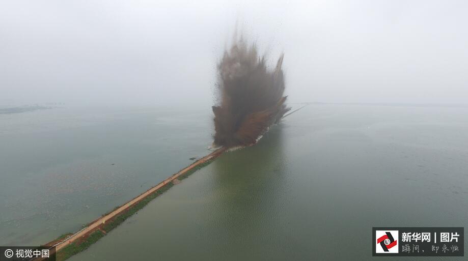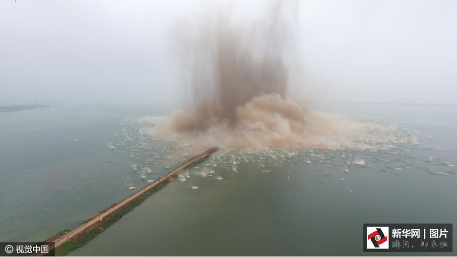 ??? 7月14日7時(shí),伴隨著一聲聲的爆破轟鳴,梁子湖與牛山湖隔堤正式實(shí)施爆破作業(yè),這標(biāo)志著湖北梁子湖流域的牛山湖正式破垸分洪。(圖片來(lái)源:視覺(jué)中國(guó))