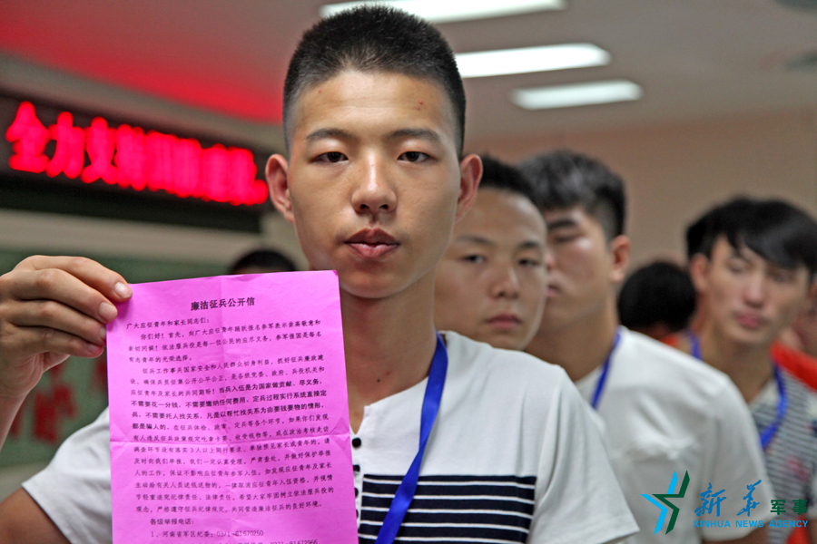 ????新華網(wǎng)鄭州8月11日電(雒根生)“當(dāng)兵入伍是為國(guó)家做貢獻(xiàn)盡義務(wù),不需要繳納任何費(fèi)用。凡是以幫忙找關(guān)系為由要錢要物的情形,都是騙人的!”河南省武陟縣喬廟鄉(xiāng)18周歲的預(yù)征對(duì)象王云祥10日收到了武陟縣征兵辦印制的《廉潔征兵公開(kāi)信》。為確保不發(fā)生一起違反征兵政策現(xiàn)象,武陟縣征兵辦公室專門印制1000份廉潔征兵公開(kāi)信發(fā)放給每一位參檢對(duì)象及家長(zhǎng),并公布了省市縣三級(jí)監(jiān)督舉報(bào)電話。