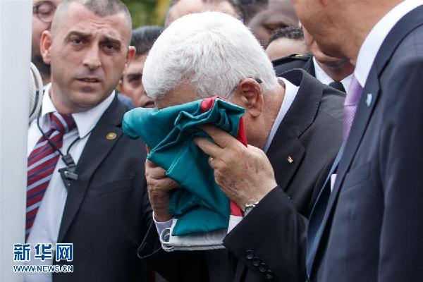 ????資料圖:在紐約聯(lián)合國(guó)總部,巴勒斯坦總統(tǒng)阿巴斯在升旗儀式上親吻巴勒斯坦國(guó)旗。新華社記者李木子攝