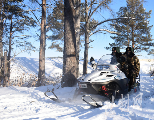 圖為在中俄界江——黑龍江北極村段,邊防官兵在零下35℃的極寒天氣中,騎乘雪地摩托巡查界江