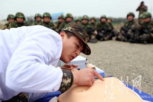 圖為在第一個(gè)休息點(diǎn)開展戰(zhàn)場(chǎng)救護(hù)科目教學(xué)