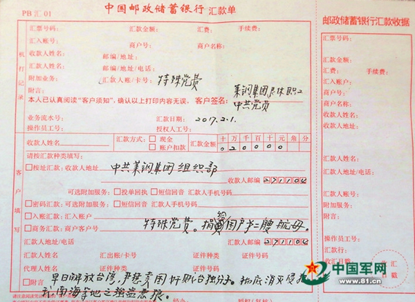 2月6日,山東省鋼鐵集團有限公司萊鋼黨委組織部接到一張匯款單,金額為兩萬元整,簽名為“中共黨員、萊鋼集團退休職工”,附言:“特殊黨費,捐給國產(chǎn)第二艘航母……”