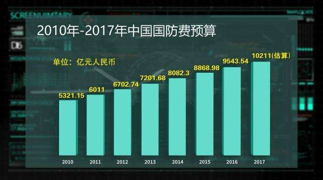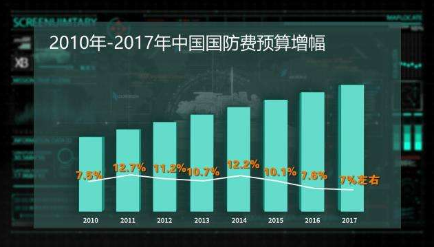 2017年3月4日,全國人大新聞發(fā)言人傅瑩在北京透露,2017年中國國防預(yù)算增幅在7%左右。