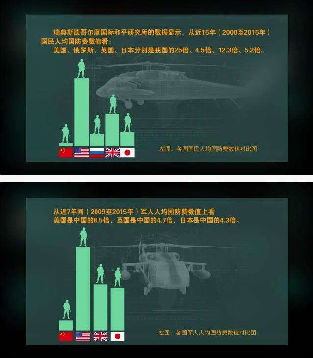 【中國人均國防費為690元人民幣,約104美元】相當于美國的1/18、日本的1/4、英國的1/9、法國的1/7、俄羅斯的1/5