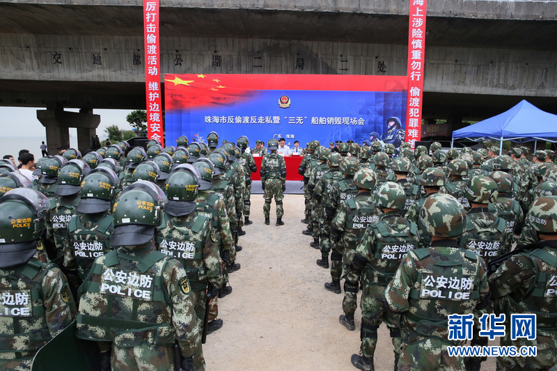 珠海邊防支隊舉行大型“三無”船銷毀現(xiàn)場會。周捷 攝