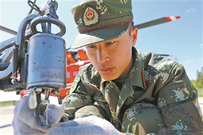 日曬、風(fēng)吹、雨淋,直升機(jī)的“衣服”——蒙布發(fā)生破損怎么辦?這可難不住心靈手巧的官兵。你看,武警森林指揮部直升機(jī)支隊的代理機(jī)械師王丹宇就自己動手,從老鄉(xiāng)那里借來手搖修鞋機(jī),頂著盛夏的烈日一針一線仔細(xì)修補(bǔ),看起來還挺有小裁縫的范兒呢。韓興華 攝