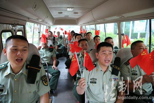 圖為官兵在去軍部舊址的車上唱紅歌