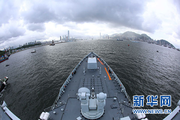 7月7日,海軍銀川艦駛?cè)胂愀郯捍薮a頭。當(dāng)日,正在執(zhí)行跨區(qū)機動訓(xùn)練任務(wù)的中國人民解放軍海軍航母編隊抵達香港,參加香港回歸祖國暨中國人民解放軍進駐香港20周年慶祝活動,受到香港特區(qū)政府和民眾熱烈歡迎。新華社記者 曾濤 攝