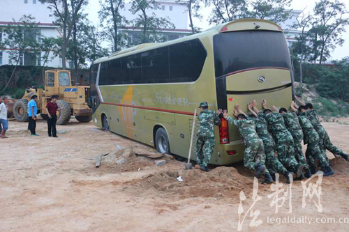 圖為官兵合力推車