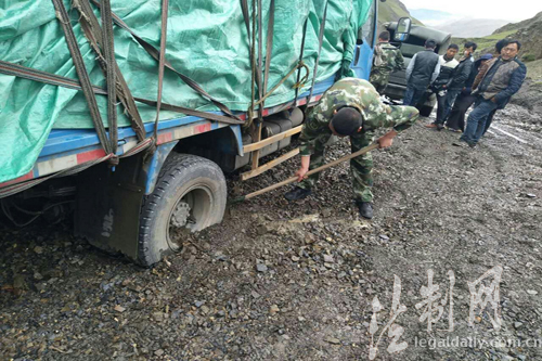 ????連日來,受強降雨天氣影響,通往西藏山南市錯那縣卡達鄉(xiāng)道路因山體塌方和泥石流損毀嚴重,7月23日中午12時,西藏邊防總隊山南邊防支隊卡達邊防派出所接轄區(qū)居民電話報警稱:商店運貨貨車在返回卡達鄉(xiāng)途中陷入泥潭,請求派出所救援。接到消息后,該所迅速組織官兵趕往現(xiàn)場,并持續(xù)關(guān)注道路情況和受困狀況。到達現(xiàn)場后,邊防官兵立即展開救援,用十字鎬挖、用手刨、用人推,經(jīng)過2個小時的不懈努力,最終成功把陷入泥坑的貨車拉出。救援結(jié)束后,邊防官兵就近取材把泥坑填平,并設(shè)立警示標志,確保后續(xù)車輛順利通過。現(xiàn)場無人員受傷,車輛完好。