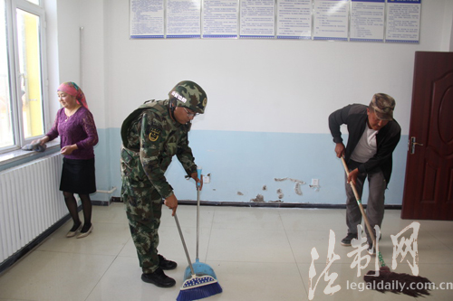 圖為“親戚”們?cè)谥鲃?dòng)為官兵打掃警務(wù)室衛(wèi)生