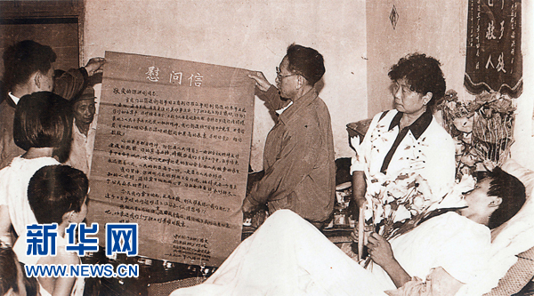 1993年8月,徐洪剛在筠連縣醫(yī)院治療10天,前來送錦旗、鮮花、食品、慰問信的人數(shù)超過5000人次(資料照片)。新華社發(fā)