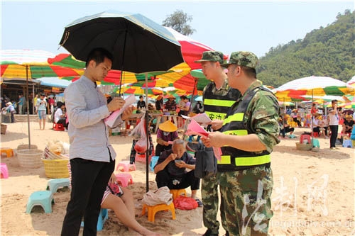 ????在天氣越來(lái)越熱的夏季,“海邊游”受到越來(lái)越多游客的追捧和青睞。尤其正值暑期,許多游客選擇帶小孩到海邊避暑。為使游客玩得舒心和盡興,廣西公安邊防總隊(duì)防城港邊防支隊(duì)江山邊防派出所針對(duì)夏季旅游景點(diǎn)溺水、小孩走失等易發(fā)多發(fā)的實(shí)際,組織官兵深入轄區(qū)景點(diǎn)開展安全宣傳活動(dòng)。