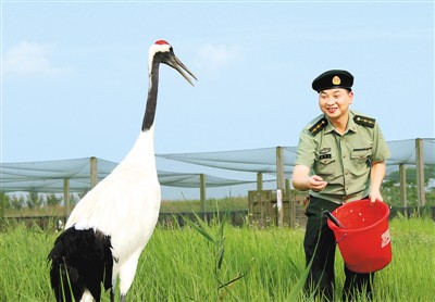 ????駐守在這里的邊防官兵主動(dòng)承擔(dān)起守護(hù)濕地生態(tài)、保護(hù)野生動(dòng)物的使命,他們?nèi)找勾┧笱策壴趶V袤的濕地。僅今年以來(lái),該所依托“警民義務(wù)護(hù)鳥(niǎo)隊(duì)”、“護(hù)鳥(niǎo)熱線”等平臺(tái),組織官兵巡邏踏查保護(hù)區(qū)核心區(qū)域120余次,定期向丹頂鶴等各類候鳥(niǎo)投放玉米等飼料。同時(shí),該所深入轄區(qū)向村民宣傳《野生動(dòng)物保護(hù)法》,讓這片土地真正成為候鳥(niǎo)的一片樂(lè)土,獲得了保護(hù)區(qū)、駐地政府以及當(dāng)?shù)匕傩盏馁澴u(yù),邊防官兵們被親切地稱作候鳥(niǎo)“守護(hù)神”。圖為官兵喂食丹頂鶴。(童瑞金 耿建平)