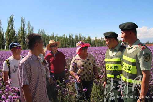????每年6月、7月,數(shù)萬畝薰衣草爭相怒放,匯成一片紫色的海洋,吸引大量游客前去觀賞。新疆公安邊防總隊伊犁邊防支隊梁三宮邊防派出所官兵因地制宜打造“紫郁之鄉(xiāng)110”這一特色警務(wù),在治安防控、服務(wù)群眾、素質(zhì)提升等方面走出了一條新路子,用使命、責(zé)任與情感為游客保駕護航,讓游客享受一趟“滿意之旅”。