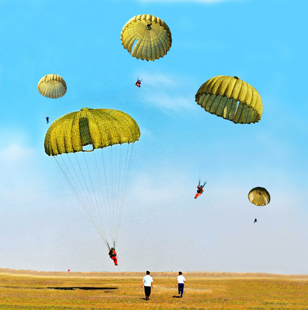 ????2001年6月,航天員在湖北進行跳傘訓練。新華社發(fā)(朱九通 攝)