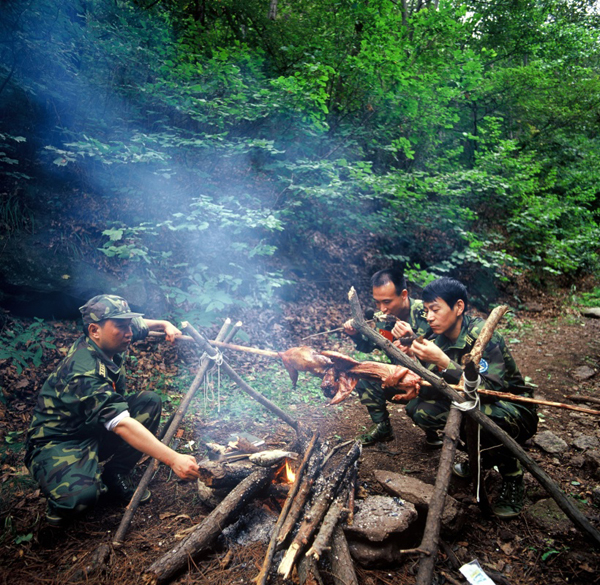 ????2006年9月16日,航天員費俊龍(中)在遼寧進行叢林野外生存訓練。新華社發(fā)(朱九通 攝)