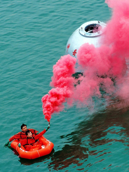 ????2005年10月17日,神舟六號返回艙在內(nèi)蒙古四子王旗中部草原成功著陸,首先出艙的航天員費俊龍看著聶海勝出艙。新華社記者 王建民 攝