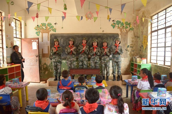 第75集團軍某特戰(zhàn)旅指揮通信連大學生女兵到駐地甸沙鄉(xiāng)草海子小學支教(2017年6月1日攝)。新華社發(fā)(張正舉 攝)